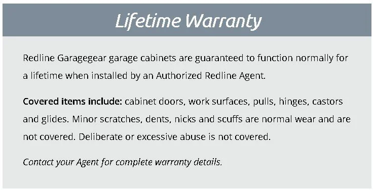 All Redline Cabinets are covered by a Lifetime Warranty. You won’t find a warranty like this on any competitive product. An abbreviated product warranty is shown below. Contact your local Authorized Redline Agent to see the full warranty.